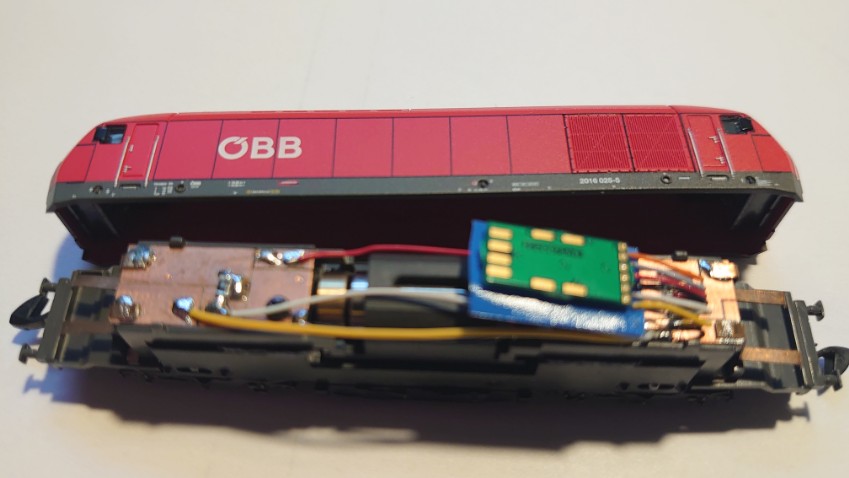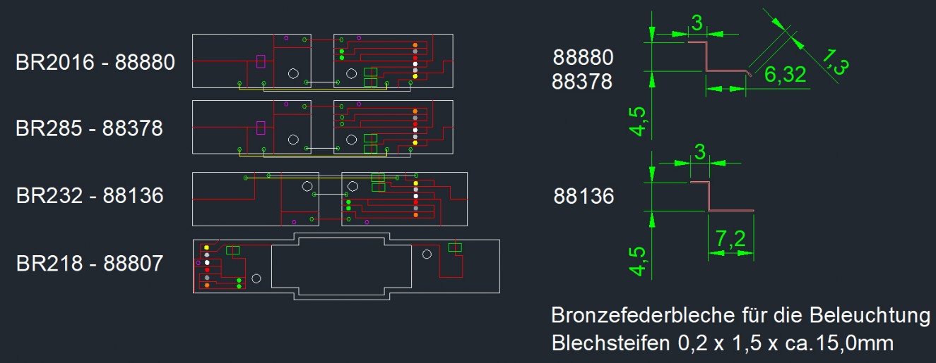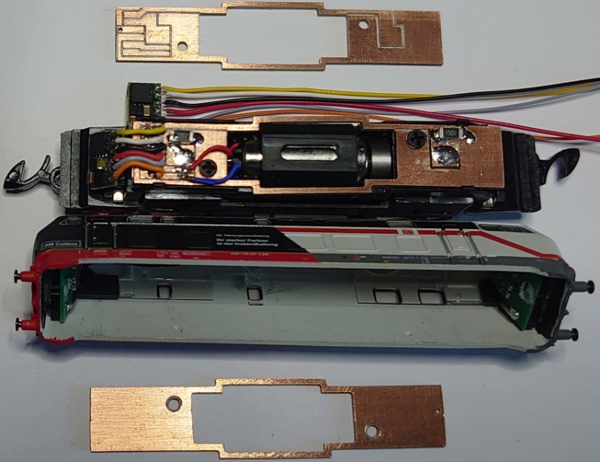 Aus der Erfahrung mit den Wechselplatinen der BR218 enstanden im Sommer 2022 noch weitere Platinen. Dabei wird immer eine zweiseitige Kupferplatine verwendet. Wichtig ist das die Bohrung zur Befestigung von unten großzugig entgratet wird. Bei mir hat die Befestigungsschaube eine Durchkontaktierung hergestellt und so einen Kurzschluß erzeugt. So wurden die BR232 und die BR2016 der ÖBB auf diese Art und Weise umgebaut. Natürlich wurde die Geschwindigkeit auf meinem Testkreis dem Vorbild entsprechend eingemessen.