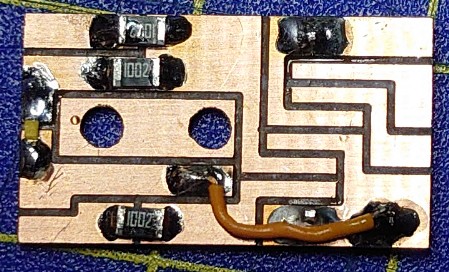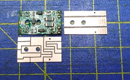 Hier möchte ich meine im April 2022 selbst entwickelten und auf meiner kleinen CNC Fräse hergestellten Austauschplatinen vorstellen. Angefangen habe ich mit der BR218 vom Märklin mit der Bestellnummer 88807. Anders als beim Original habe ich mich dazu entschieden die neue Platine aus einem Stück zu fräsen. Der Platz ist ausreichend und die Montage wird vereinfacht. Das Auflöten des Decoders ist sehr filigran, da die Leiterzüge sehr klein sind und eng beieinander liegen. Auf dem Bild sind die beiden Seiten sehr gut zu erkennen. Sollte die Lok in die falsche Richtung fahren oder das Licht nicht stimmen, so kann das mit Hilfe der CVs im Decoder angepasst werden. Der Decoder von Doehler & Haass mit der Bezeichnung PD05A-3 - Nano-Lokdecoder ist auf dem Bild zu sehen. Dieser passt sehr gut in die kleine Lok.