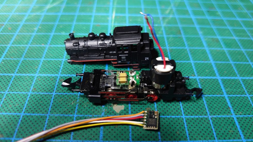 Da bei mir alle Loks digital fahren, durft dieser Umbau natürlich nicht fehlen. Hier wurde nur die originale Speicherplatine entfernt, das durchsichtige Plastikteil etwas bearbeitet und dann der Decoder eingebaut. Die Kabel vom Motor reichen sogar bis zum Decoder. Eine Beleuchtung habe ich nicht vorgesehen.