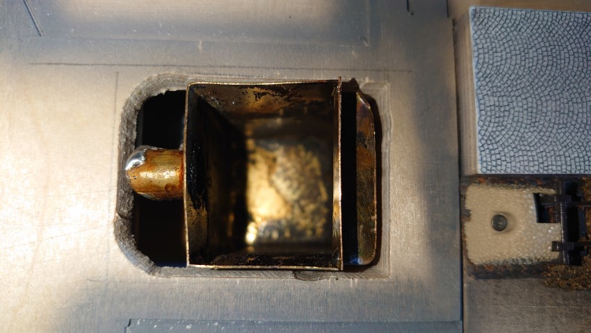 Die Bestückung erfolgt durch Abnehmen der Fabrik. Im "Keller" befinden sich die Heizkessel. Hier ist nur der obere Rand der Brennkammer zu erkennen.