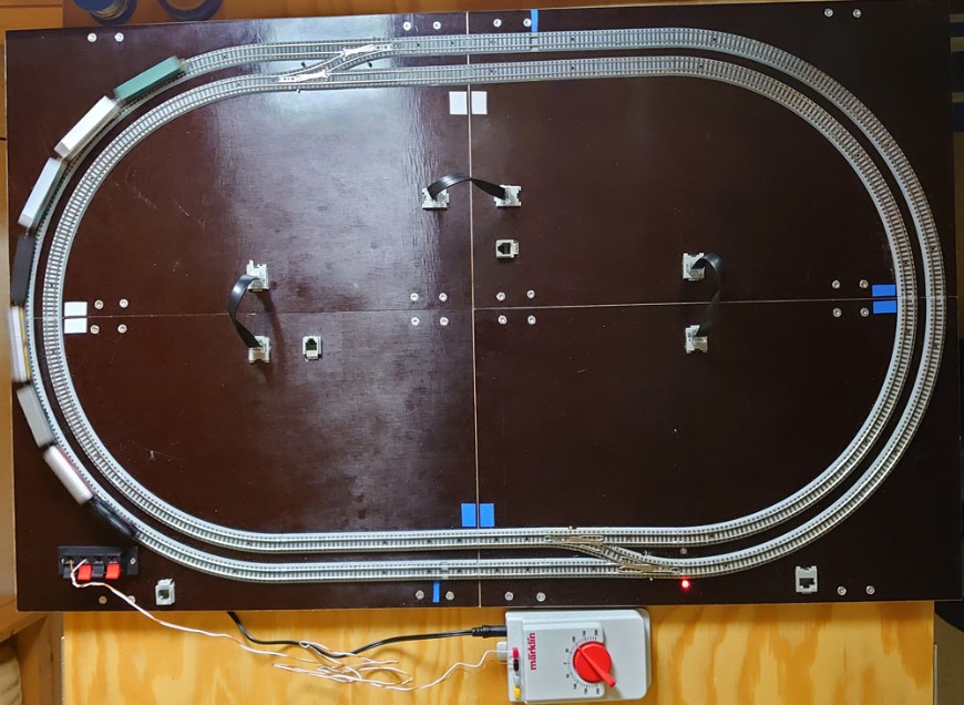 Auf diesem einfachen Testkeis mit einer Größe von 0,80m x 0,50m, welcher im Jahre 2022 entstand, habe ich die Möglichkeit meine Fahrzeuge einzufahren und ausgiebig zu testen. Um die digitalen Fahrzeuge annähernd mit Vorbildgeschwindigkeit fahren zu lassen, gibt es im Gleis eingelassene Kontakte. Mit einem Arduino wird die Zeit für eine Strecke gemessen und die Modellgeschwindigkeit wird entsprechend umgerechnet.
