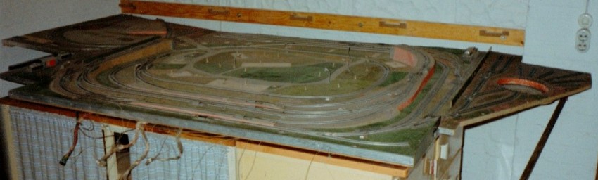 Ein Bild der ersten TT-Anlage, drei einfache Kreise auf dem Gleis der Berliner TT Bahnen. Die Anlage entstand ca. 1980 und wurde ingesamt 2x erweitert. Es war eine, aus Holz, selbstgebaute Drehscheibe (rechts im Bild) und ein Sägewerk auf der linken Seite. Im Jahre 1991 wurde die Anlage abgerissen. Die Anlagengröße betrug ca. 2,60m x 1,50m. Dieses Bild ist während dem Abriss entstanden. Dadurch fehlt z.B. schon die Brücke.