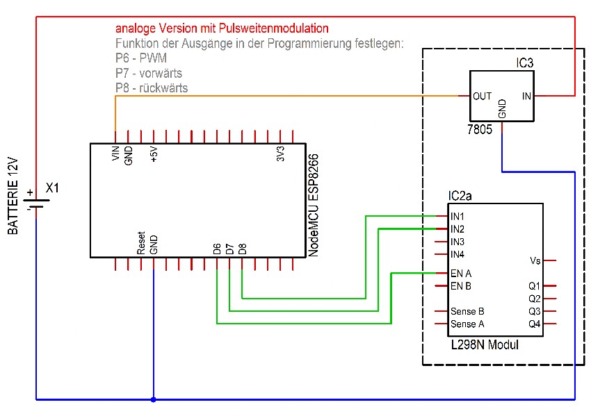 Die Zuschaltung der Gleisspannung erfolgt über Pin D8 ("enable"), deshalb kommt die Spannung erst an, wenn ein Befehl kommt. Das ist für die Notstoppfunktion wichtig. Wenn der Kontakt zur ESP (z.B. die App beendet wird, das Smartphone in den Ruhemodus geht, WLAN unterbrochen wird) verloren geht, schaltet D8 ab und damit die Bridge auch.