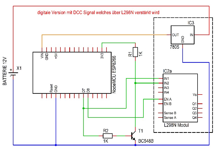 Hier wird eine einfache Lösung vorgestellt. An dieser Stelle möchte ich darauf hinweisen, das ich für Schäden, die beim Nachbau entstehen können, nicht hafte. Ihr benötigt für diese Lösung nur den ESP Controller, den Treiber L298N, evtl. einen Transistor mit 2 Widerständen, ein Netzteil mit 12V DC (Gleichspannung) und die zur Steuerung erforderliche App mit Smartphone oder Tablet. Die Software könnte z.B. die Z21 App von der Firma Roco sein. Die Materialkosten beliefen sich im Februar 2022 bei ca. 15,00 bei einem vor Ort Händler in Berlin (ohne Netzteil).
