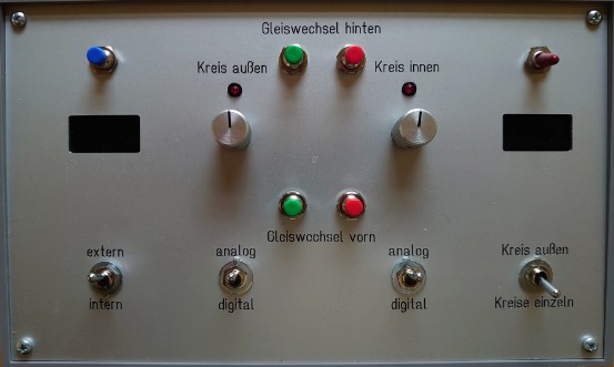 Für diese Anlage gibt es ein externes Bedienpult. In diesem ist ein Arduino Controller für die beiden analogen Kreise montiert worden. Die Drehimpulsgeber regeln das Pulsweitensignal. Durch Druck auf den Regler wird die Fahrspannung sofort auf Null gesetzt.