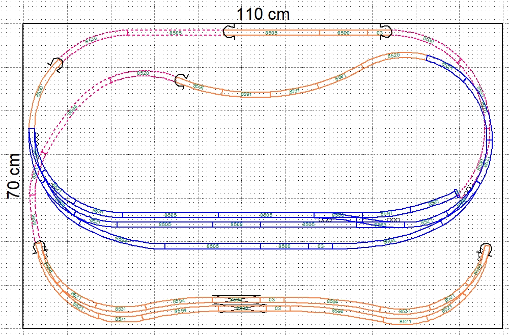 Auf den rechten beiden Bildern ist der Gleisplan dargestellt. Der maximale Höhenunterschied vom Schattenbahnhof bis zum "Hauptbahnhof" beträgt 83mm. Alle Fahrzeuge kommen bei den Steigungen ohne Haftreifen aus obwohl die Steigung max. 3% beträgt. In einem Test hat die BR94 immerhin sechs dreiachsige Rekowagen gezogen. Hier gibt es den Beweis.